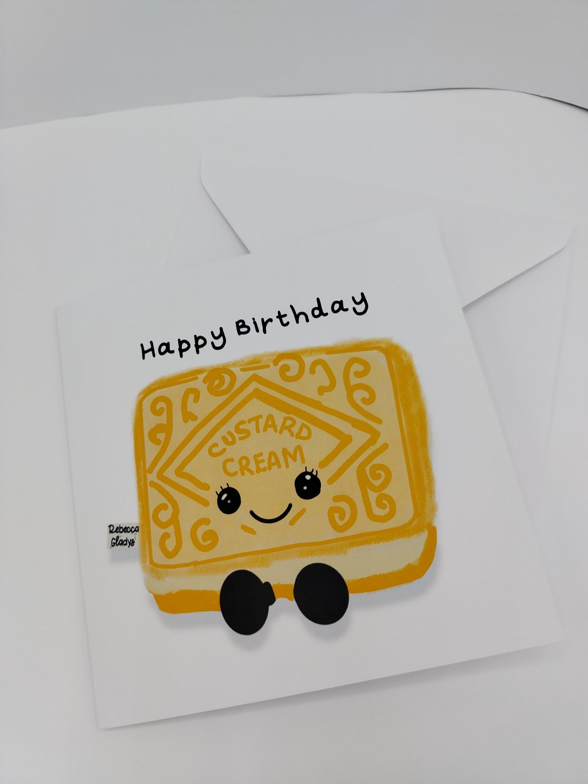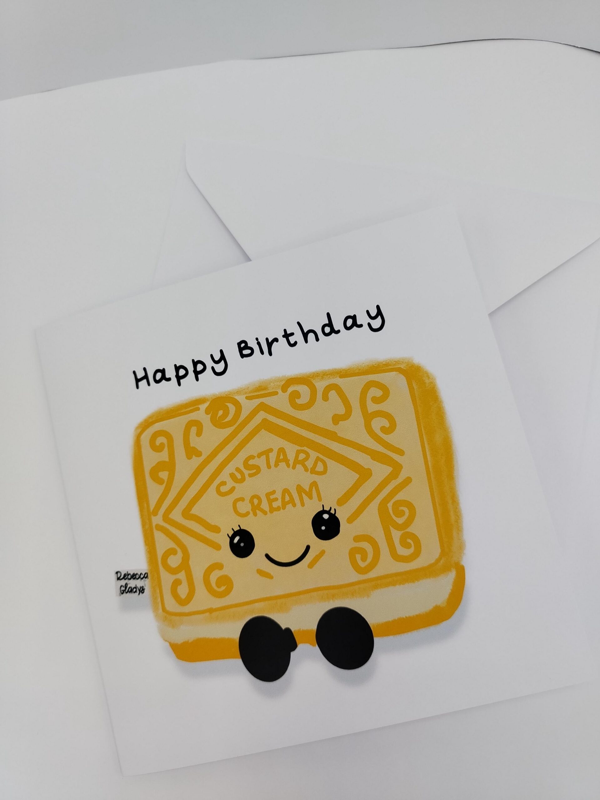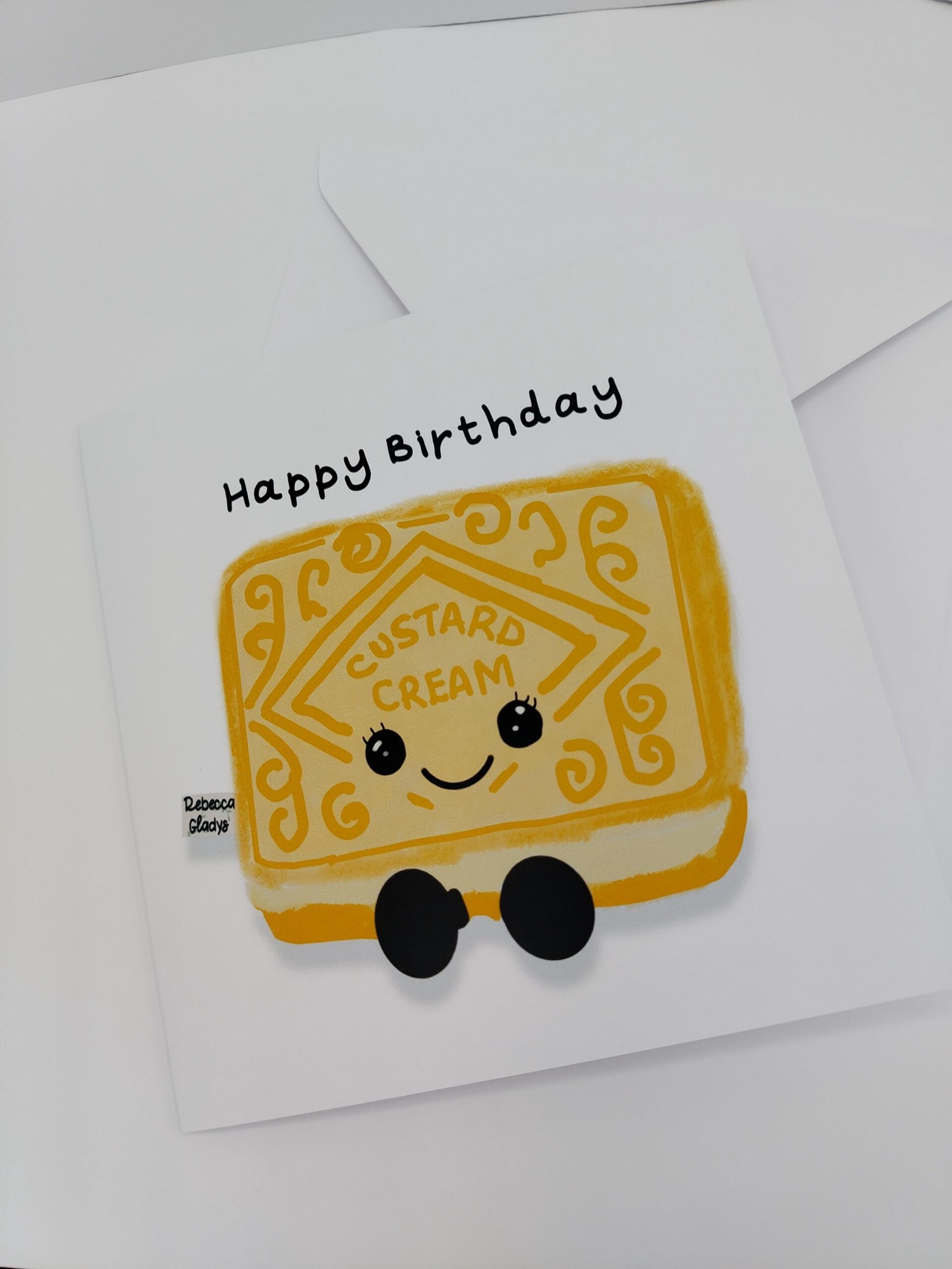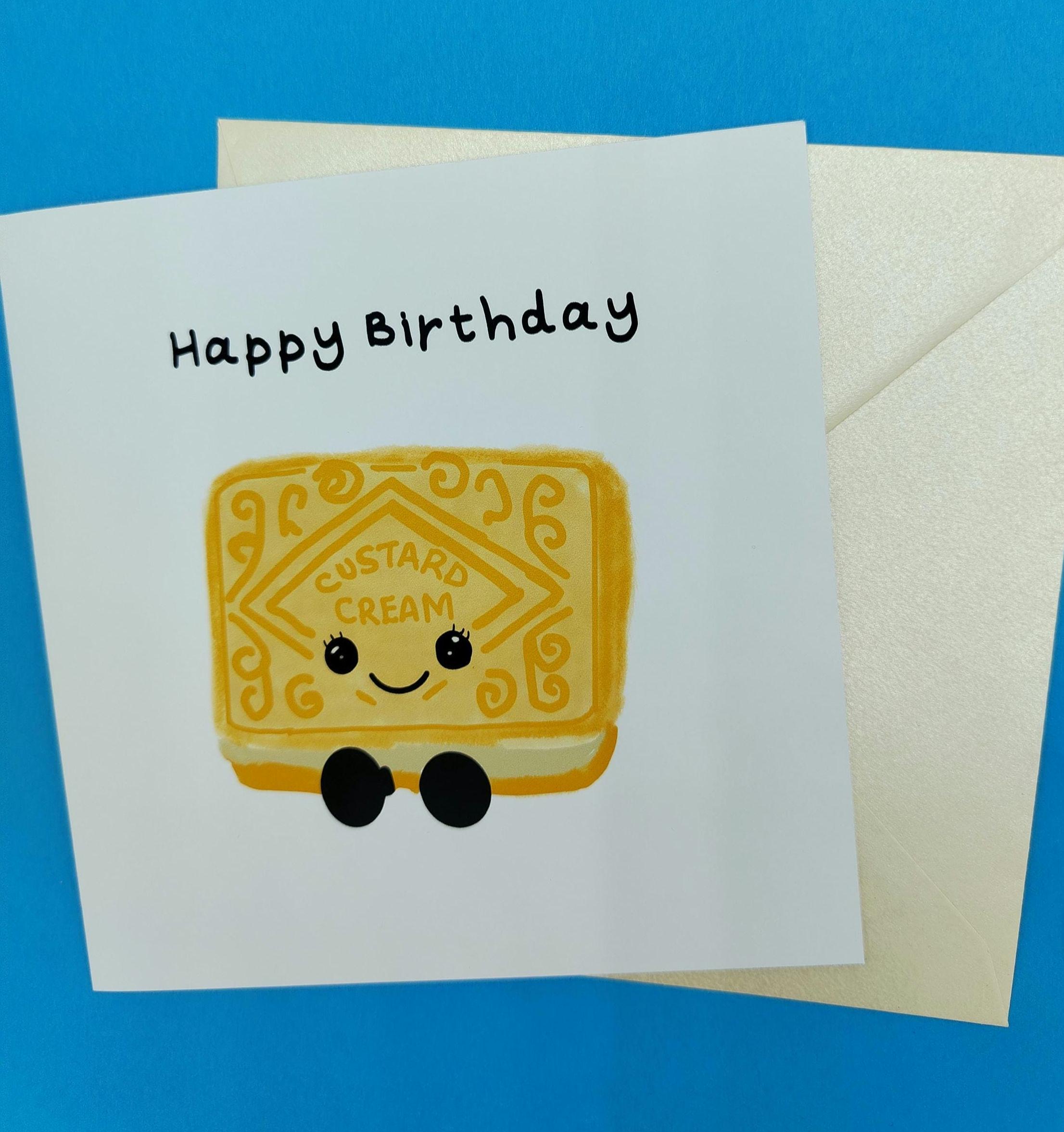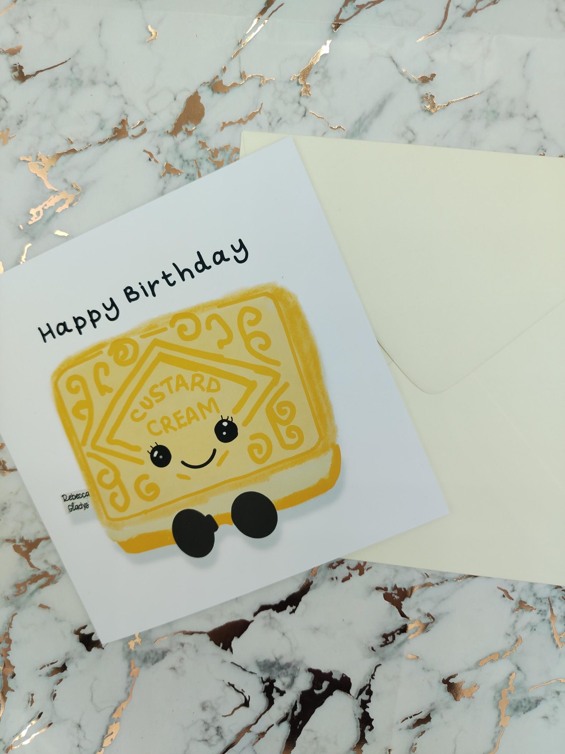 Custard Cream Happy Birthday Card – Cute Biscuit Character Design
